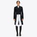 This women's riding tailcoat combines elegance and performance. The highly breathable and water repellent technical 4-way stretch fabric follows trough your movements without constriction. The fabric also provides antibacterial properties and UV protection, ideal for sports activities. The tailcoat is refined by alcantara collar, piping and points, while the metallic buttons are refined by a logo. Bottom tails include removable weights for greater stabilty and elegance during performance. The look is completed by a functional front pocket and an embroidered logo on the shoulder.