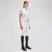 This special garment is dedicated to horsewomen who want to express their femininity even while competing. The slim fit elongates the figure and accents the waistline, while the supple, breathable elasticated jersey stretches in all four directions and is also crease-resistant. The high collar, sleeves and placket are in a contrast colour, and the ruffle detail on the front adds a precious note, characterizing the entire garment. ‘Cavalleria Toscana’ is embroidered on the back of the collar.