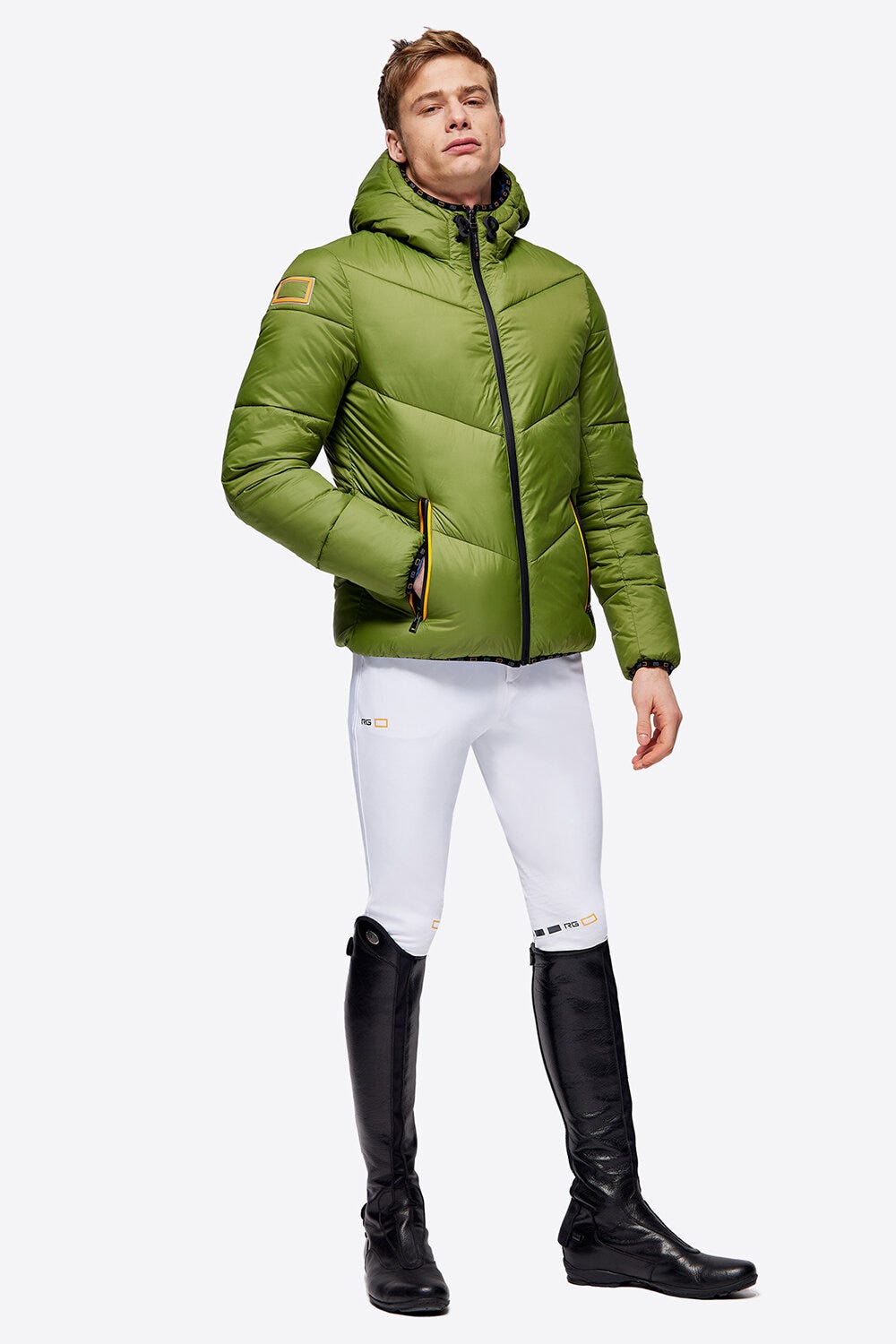 Piumino da training con cappuccio avvolgente, cintura in vita, spacchi con zip e chiusura con zip termonastrata a doppio cursore. Fondo maniche in lycra® con foro passapollice.