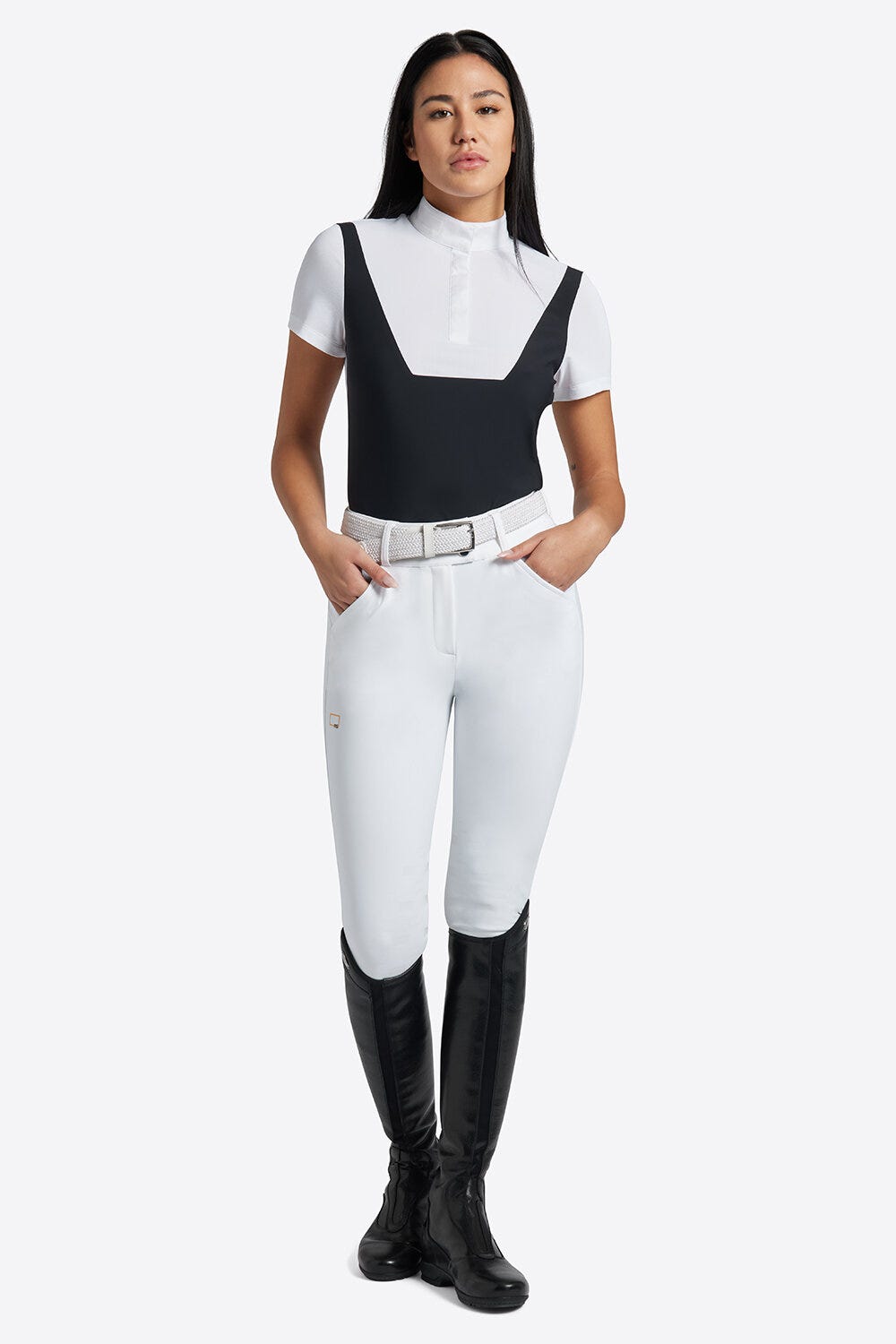 Polo da competizione donna a manica corta.Ideale per tutte le amazzoni. Realizzata in piquè di Jersey tecnico elasticizzato con inserti in mesh che conferiscono maggiore traspirabilità.Collo in popeline con dettaglio logo gommato e bottoni automatici nascosti sul collo, per unire design e comfort.